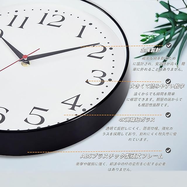 耐久性と実用性:この時計 壁掛けは、軽量でありながら頑丈なポリカーボネートフレームと精密な金属構造を採用し、長期間使用しても形状や性能が損なわれません。特にその高精度設計は、時刻を長時間にわたり正確に維持します。また、埃がたまりにくい設計で掃除が簡単。電池式のため、取り付けや使用も手間がかかりません。このような実用性と高精度を兼ね備えた掛け時計は、どんな空間にもフィットします