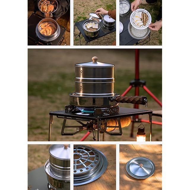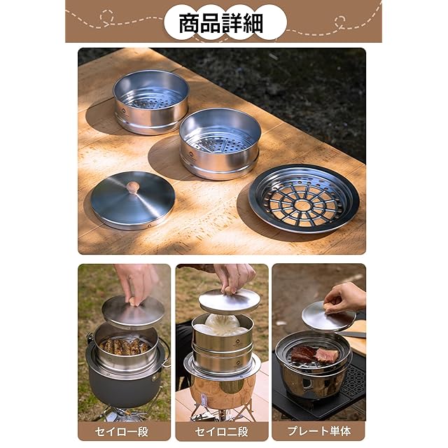 [簡単な使い方と調理時間] せいろは水で濡らし、アウトドアクッカーに水を入れて沸騰後、プレートとセイロを乗せて使用します(必ず弱火). 冷やごはんは約2分、肉と野菜は約5分~10分ほどで蒸し上がります。