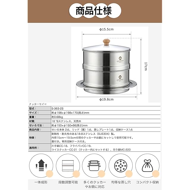 [充実のセット内容] セット内容はクッカー蒸しせいろ本体2つ(2段)に蓋、プレートとなります. クッカーは付属しておりません。内径15cm〜19.5cmの間のクッカーやお鍋にセットしてご使用してください。