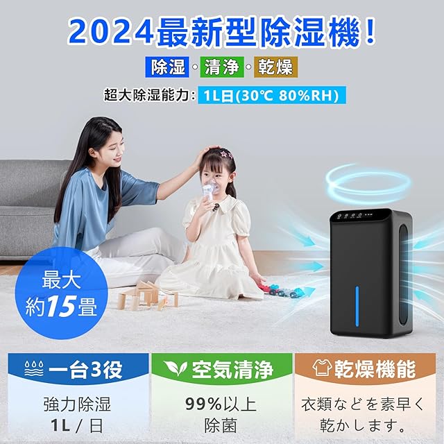 商品名:【画期的】除湿機 大容量 強力除湿 除湿器 部屋干し 湿気取り 【除湿量1L/日 15畳】衣類乾燥 2.5L大容量 マイナスイオン機能付き 切タイマー機能 任せモード 満水自動OFF 小型 除湿機 湿気/梅雨対策 ・結露/カビ防止 コンパクト 7色ライト 静音 省エネ 人気 脱衣所 トイレなどに適用 日本語取扱説明書付 PSE認証済 (マットブラック)