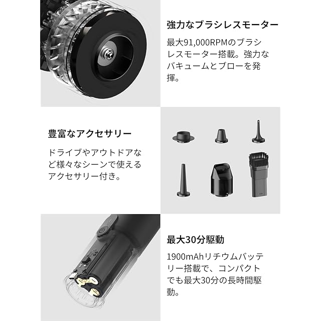 【 強力なブラシレスモーター 】 最大回転数91,000RPMのブラシレスモーターを搭載しており、強力なバキュームとブローを発揮します。