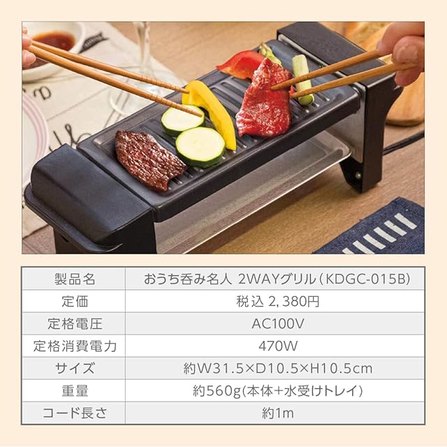 商品名:おうち呑み名人 2WAYグリル おうちでアツアツ!焼き鳥も焼肉も楽しめる!2WAY仕様の電気グリル。KDGC-015B おうち飲みに便利 簡単 おつまみもおいしく ライソン LITHON