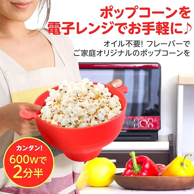 ⭐自宅で簡単に、出来立てアツアツのポップコーンが食べられます! ⭐本体中央下部の計量カップ部分に、適量のコーンを入れて、付属のフタをのせたらレンジでチン。600ワット・2分半でノンオイルポップコーンが完成します! ⭐使わないときにはコンパクトに畳んで収納可能! ⭐ご家庭用・お祝い事など、贈り物ギフトにも最適なポップコーンメーカーです。 ⭐安心・丈夫なシリコン製のため、ご使用後は家庭用洗剤などで洗えます!