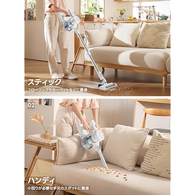 【自由伸縮パイプ・2way仕様・究極便利操作】軽量掃除機には10段階伸縮可能なパイプ付属し、身長に合わせて調整可能、床面、カーテンなどの高度違い所にも対応できます!さらにスティック掃除機とハンディ掃除機の2WAYモデルが展開されており、付属の多様なノズルを交換して階段・布団・家具の隙間・車など、様々な場所で快適に掃除できます。掃除中トリガーを押し続けることは不要、吸引モードもワンタッチで簡単に切替が可能。パネルに電量、充電状態、モード切替の表示も一目でわかるランプが搭載。お年寄りも子供もラクラク掃除できます。