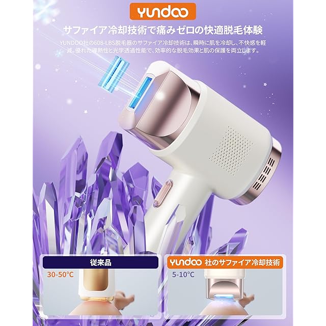【お肌に優しいIPL技術+新しいサファイア冷却技術⇒無痛脱毛を実現❕】YUNDOOのIPL脱毛器は、サファイアクリスタルと半導体冷却技術によって可能となった新しい冷却機能を搭載しているIPL方式のフラッシュ型ムダ毛ケア器です。使用時にお肌を4℃まで冷却し、照射時の刺激と肌への負担を軽減し、無痛脱毛を実現します。それによって、お肌を優しく守り、面倒な保冷剤での冷却も不要です。これからはより快適な脱毛体験をお楽しみに。