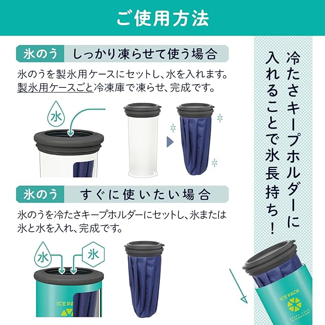 素材・材質:内びん/ステンレス鋼、胴部/ステンレス鋼 (アクリル樹脂塗装)、氷のう本体(袋)/ポリエステル (TPUコーティング)、口金/ポリプロピレン、口金止め/アルミニウム、キャップ/ポリプロピレン、パッキン/シリコーンゴム、製氷用ケース/ポリプロピレン