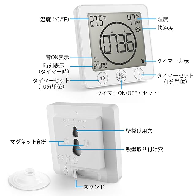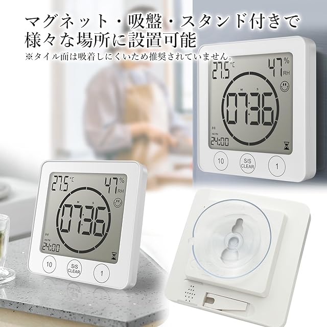 デジタル時計 温度計 湿度計 タイマー 見やすい 壁掛け 卓上置き マグネット 吸盤 脱衣所 キッチン リビング