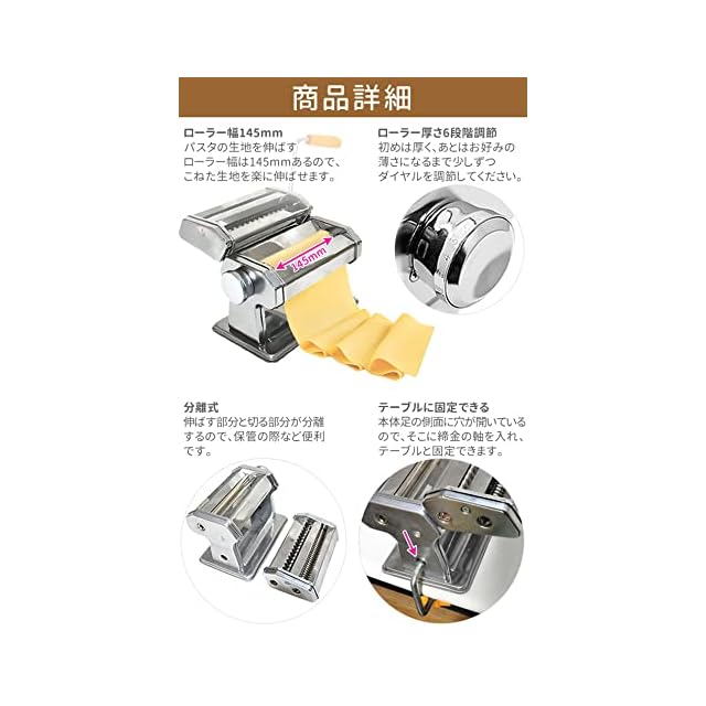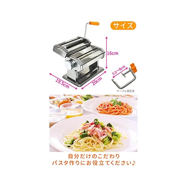 <p>難しそうに感じる「伸ばす・カットする」はパスタメーカーを使えばラクラク。<br>麺がスルスルとパスタメーカーから出てくるところを見ると、なんだか感♪<br> <br>ローラーは調節可能<br>伸ばす部分と切る部分が分離するので取り運びが便利です。<br> テーブル固定用のクランプも付いているので、安定性も非常に高くなっています。<br><br>平面パスタだってOK!<br><br>【商品詳細】<br> サイズ(約):本体・幅20×高さ16×奥行き19.5cm<br>テーブル固定具・約5.5~8cmまでの厚さに対応<br>カッターサイズ:幅 2.0mm / 幅 4.0mm<br><br><br>※※※お手入れ方法と注意※※※<br><br>【水洗いは錆の発生原因となります。】<br> 水洗いをした場合、必ず本体・ローラー・カッターに至る部分まで湿気が残ります。<br>湿気による錆の発生は故障の原因になるだけでなく、衛生上もよくありません。<br> 絶対に水洗いや湿った布で拭くのはおやめください。<br><br>・ローラー部やカッター部は、ブラシで払うか乾いた布で汚れを払ってください。<br> 決して水洗いはしないでください。<br><br>・ローラー部やカッター部の両端はオイルレスになっています。<br> この部分へのオイル注入は、生地のオイル混入につながりますので、おやめください。<br><br>・製品を分解しないでください。故障の原因となります。<br> <br>・ローラー部やカッター部に「練り生地」「麺帯」等がつまった場合は、<br>生地が乾いてから竹串などで取り除いてください。<br><br><br> 【ご使用の注意】<br>・初めてご使用される際には、少量の「練り生地」を数回通し、<br> ローラーやカッターの表面についている「オイル」や「バリ(金属片)」を取り除いてください。<br>その際使用した「練り生地」は捨ててください。<br><br> ・パスタやうどん等の麺を作る以外の目的でのご使用はおやめください。<br>・ローラー部やカッター部に硬いものを入れての操作は故障の原因となります。<br> <br>◆輸入品◆<br>説明書、及び日本語取扱説明書は付属致しません。<br>取り扱いについてのサポートはできません。<br> 入荷時期により予告無くデザインや色やサイズなど、細かな仕様が変更される場合がございます。<br> 新品未使用でございますが輸入商品につき多少の傷・汚れはご了承くださいませ。</p>