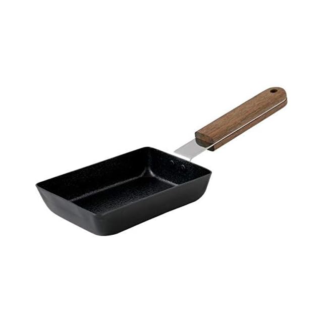 蓄熱性の高い鉄製で、卵一個で卵焼きがふっくら焼けます。鉄版の表面には特殊な加工を施し、油馴染みを良くさせ、食材と鍋が接する部分を凹凸で少なくして、焦げ付き、こびり付きを抑えます。木柄は水に強くタフなチーク材です。油分を多く含み、船のデッキ材にも使われるほど水に強い素材です。仕上げは天然オイル塗りで、パサつきを感じたら、食用のオイルを薄く塗ると長持ちします。
