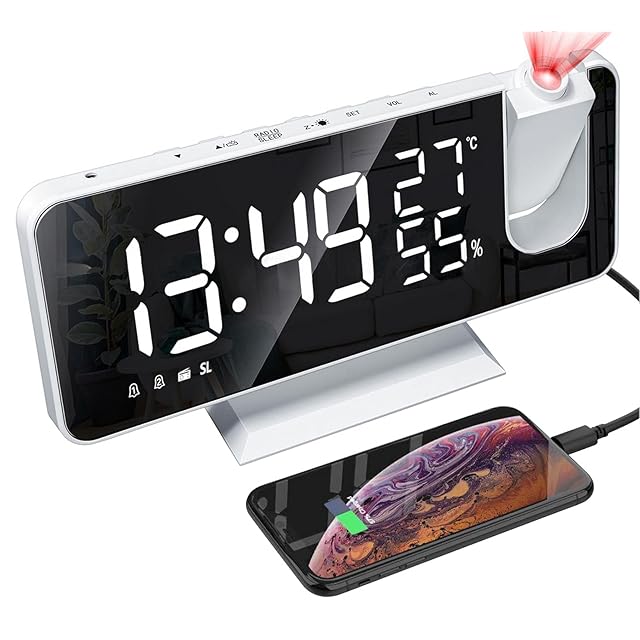 yiteng デジタル時計 多機能時計 目覚まし時計 LED時計 スヌーズ クロックラジオ 置き時計 壁/天井投影 鏡 温度/湿度/FMラジオ/ミラー/プロジェクター/アラーム 携帯充電 自動輝度調節 音量調整 光センサー 自動調光 ホワイト 白色 投影180度回転調整可能 おしゃれ 電波 USB給電 日本語説明書付き