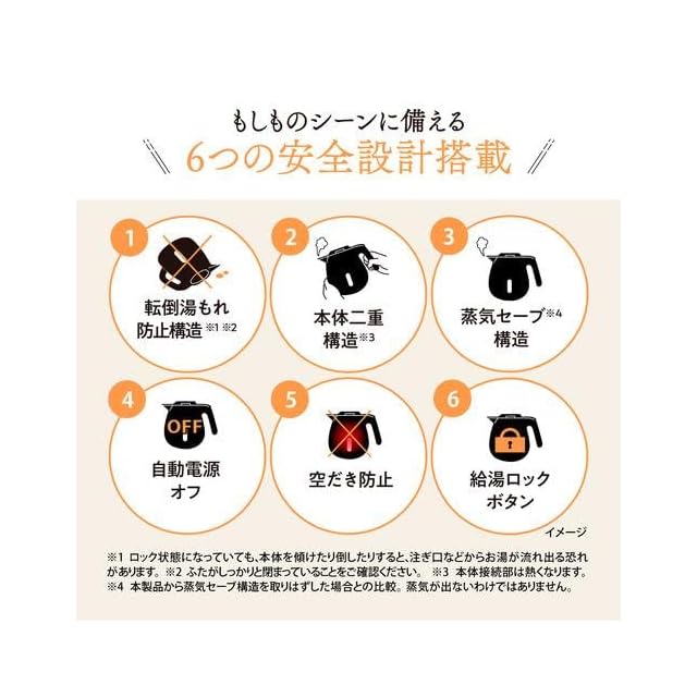 シンプル機能でベーシックな電気ケトル。ベーシックながらも6つの安全設計を搭載しており、使いやすさと安全性を兼ね備 えています。