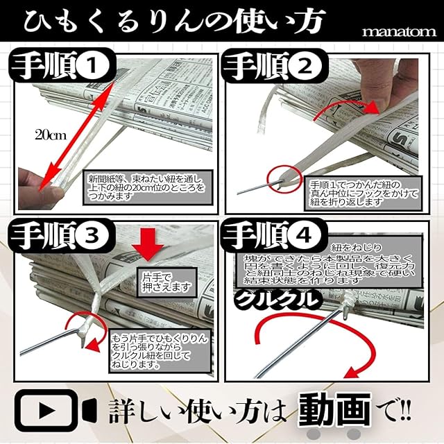 もう紐は結ばなくても大丈夫!クルクル回してねじって簡単結束。溜まった新聞紙、古雑誌、ダンボールの束、 なかなかうまく縛れずお困りの方への必須アイテム。 <br>女性の方やお年寄りの方・手の力が弱い方でも楽しく簡単に結ぶ事ができます。しかも短時間でガッチリ縛れます。 <br>お引越し時にも大活躍。本商品は丈夫な素材(ステンレス鋼)でできており、末永くお使い頂けます。