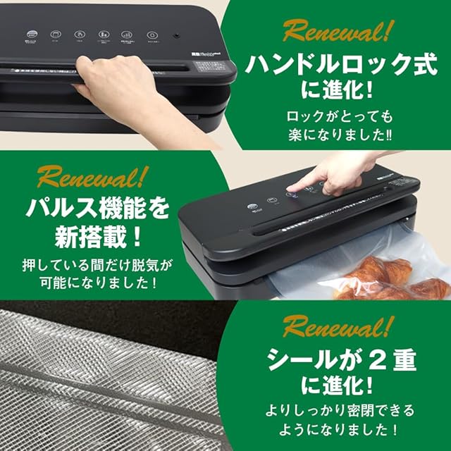 商品名:真空パック機 真空パックんplus2 プラス2 吸引力85kpa 脱気シーラー 真空パック機械 袋 ロール 替えロール 家庭用 業務用 米 食品用 低温調理 真空調理 エンボス加工 別売りキャニスター 20cm 28cm ロール 大 小 L M (真空パックんplus2 本体)