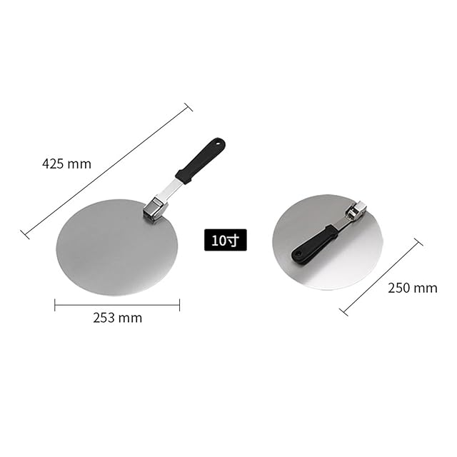 【ピザシャベルのサイズ】:丸いピザヘラ 1本。長さ: 42.5cm 幅: 25.3cm。素材:ステンレス鋼+ PP。色:シルバー。折りたたみ式のデザインで、ピザを鍋やフライパンに簡単に入れることができます。