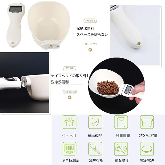 【高品質】:安全で信頼性があり、取り付けと取り外しが簡単で、使用後の清潔さが簡単で、高品質PP材料を採用して作られている。秤のデジタルサイズ:23*9.5*5 cm、内容量:250 ml。<br><br><br>【使いやすさ】-最大重量は300 gまで。使いやすく、CR 2032ボタン電池(電池を含まない)を挿入して使用できます。ペットフード測定バーは取り外し可能で、清潔で簡単で、保管も簡単です。<br><br><br>【多機能】鮮明なLCDディスプレイを使用して、4単位(g、ml、cup、oz)を切り替えて、液体量と固体物量を測定することができる。<br><br><br>【CDディスプレイ付き】:LCDディスプレイ付きデジタルスキャンスケールはペットフードと水の重量を測定する理想的な選択である。メモ:読み込みに影響を与えるために、レベルを維持してください。<br><br><br>【取り外し可能な測定カップ】取り付けと取り外しが簡単で、使用後の清掃も簡単です。ペットの食べ物や水を計量する理想的な道具として。壁掛け可能な大きなフック穴。デジタルペットフードスキャナーを使用すると、ペットフードの正確な重量を測定し、時間を節約し、潜在的にお金を節約し、犬に適切な栄養を与えて食べ過ぎを防ぐことができます。