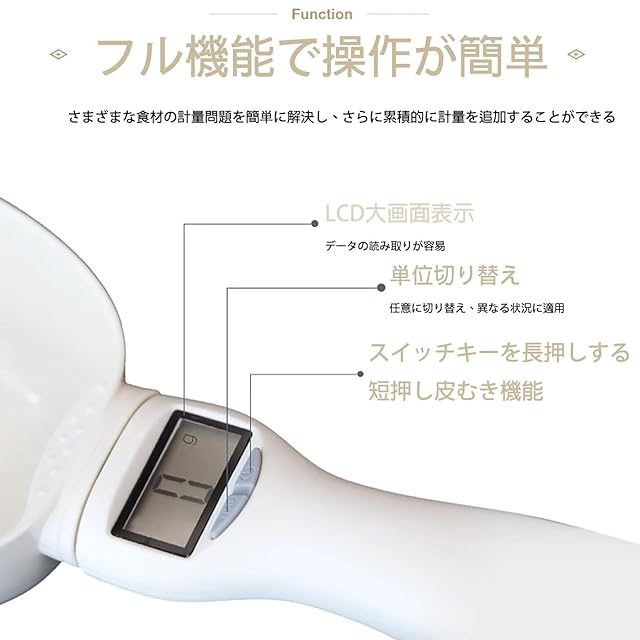 【多機能】鮮明なLCDディスプレイを使用して、4単位(g、ml、cup、oz)を切り替えて、液体量と固体物量を測定することができる。