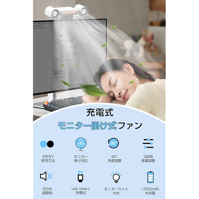 商品名:扇風機 クリップ扇風機 【2025年夏新登場・暑さ対策の新モデル・2In1多機能デザイン】 卓上扇風機 小型 大風量 静音 USB充電式 3段階風量調整 モニター掛け式 卓上スタンド式 スクリーンライト付き 90°風向き調整 軽量 省エネ 熱中症対策 オフィス 寝室 図書館