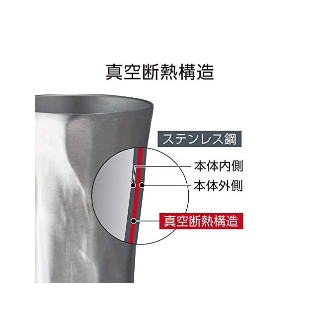 ステンレス二重構造で、本体内側と外側の間は真空になっています。そのため外気への熱伝導がおさえられ、冷たいものも温かいものも飲みごろ温度を保ちます。