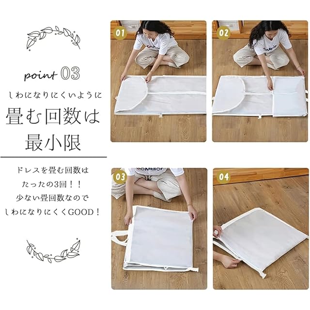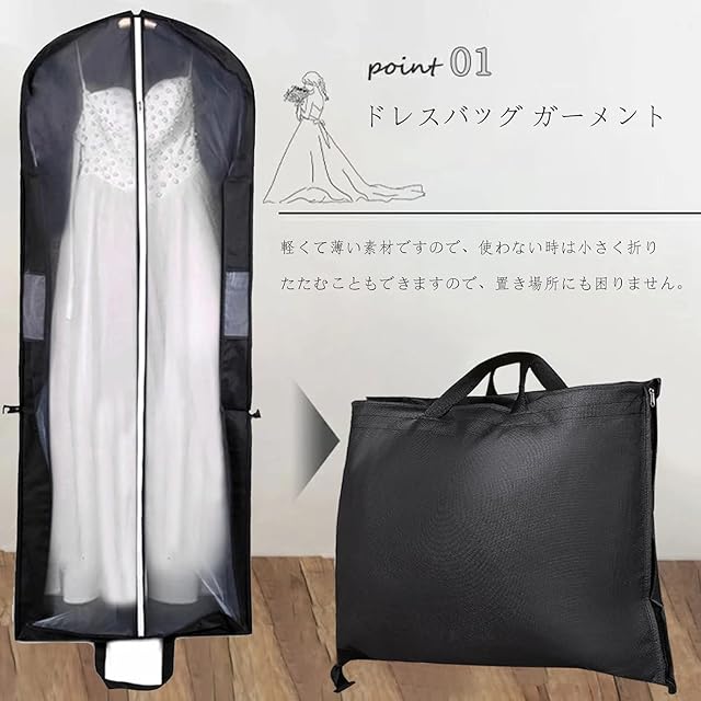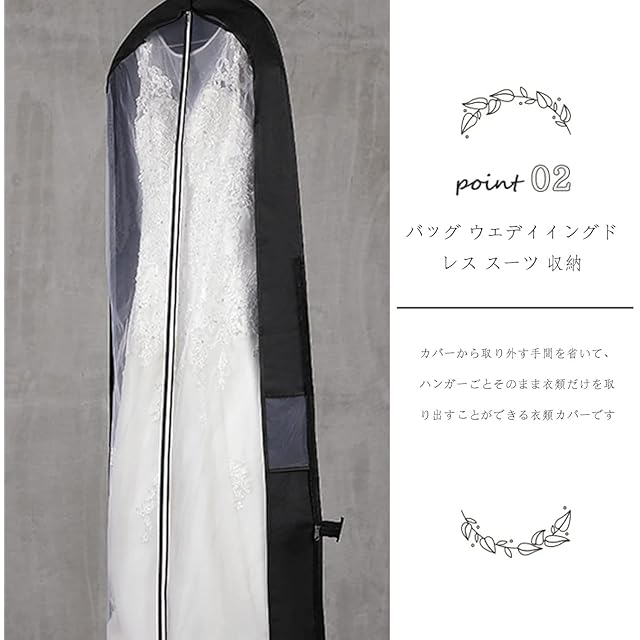 適用シナリオ:結婚式のウェディングドレスや、丈の長いドレスの収納などにもおすすめです。ファスナーを開けておけば、ドレスカバーとしてもお使いいただけます。