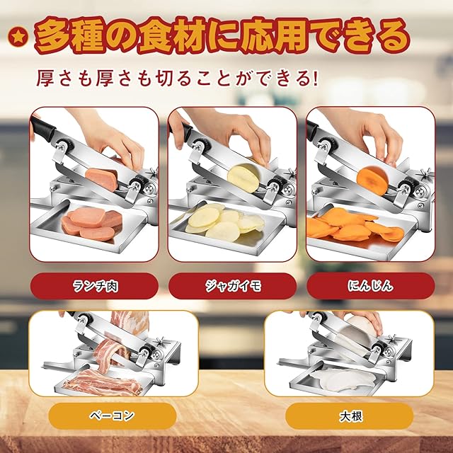 ♦「広い適用」 野菜/お餅/かき餅/お菓子/ベーコン/ハムを簡単にカットします。ご家庭から業務用まで幅広くお使いいただけます。