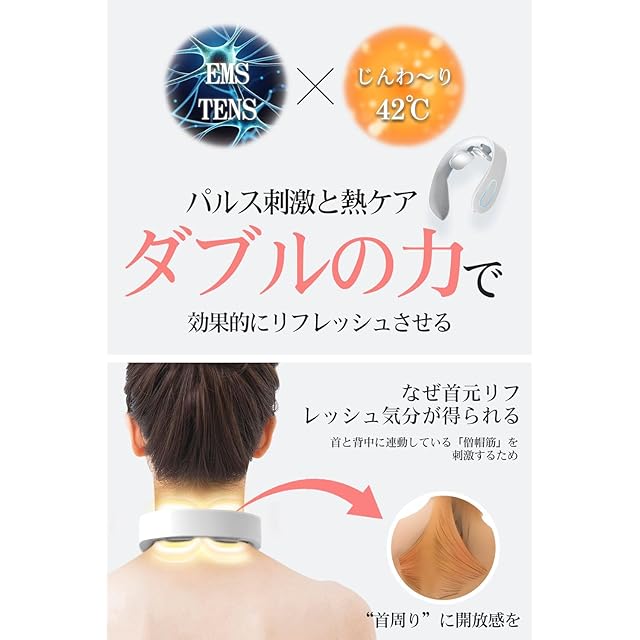 商品名:【理学療法士監修】 ネックケア 首 リラクゼーション器 熱ケア x EMS&TENSのW効果 首元リフレッシュ 軽量 小型 USB充電式 コードレス 音声ガイダンス付 10種モード 15段階強度調節 プレゼント ギフト 贈り物にもピッタリ 新登場 日本語説明書 (ホワイト)
