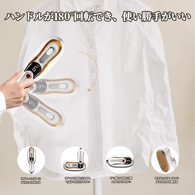 【180ml大容量・便利デザイン】180mlの容量タンクがあるために、1回の給水で約15分の連続使用が可能です。360°全方向スチーム噴射で、ハンガーにかけたままでも裾までムラなくケア。先端極細ノズルで、ボタン隙間や襟元の頑固なシワも攻略。