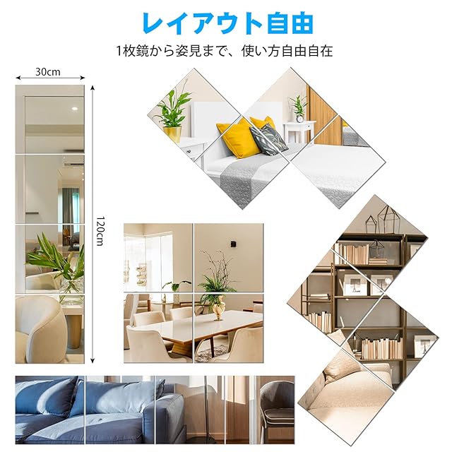 Wildhorse 【割れない鏡】全身鏡 姿見鏡 貼る鏡 壁鏡 壁掛け アクリルミラー ウォールミラー 割れないミラー 飛散防止 日本語取説付 (30x30cm 4枚セット) 角丸