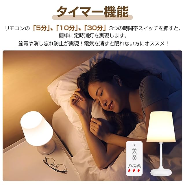 【リモコン/タッチで10段階調光・メモリー機能・定時消灯機能】リモコンの「+」または「-」ボタンを押すか、ランプベースのボタンをタッチするたびに、明るさを10段階調整できます。ライトをオフにすると、調節された明るさと色温度が自動的に記憶されます。再開する時、消灯前の点灯状態に戻ります、わざわざ調節必要がなくてとても便利です。リモコンで就寝時に便利なスリープタイマーを15分/30分/60分に設定できます。設定後、適応な時間が経過すると自動的に消灯し、節電や消し忘れ防止が実現!電気を消すと眠れない方にオススメ!