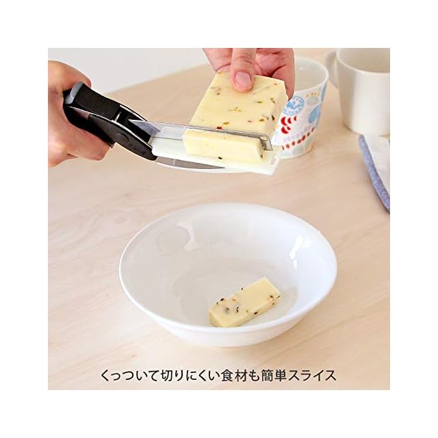 クレバーカッター 商品情報 <br> 【カラー】ブラック <br>【サイズ】(約)7.5×2.8×24.7cm / 刃:(約)10.7×2cm <br>【重量】約190g <br>【材質】まな板部:ポリアセタール / 刃部:ステンレス / 取手:ポリプロピレン、ABS樹脂 他 <br>【耐熱温度】85℃ <br>【生産国】中国<br>