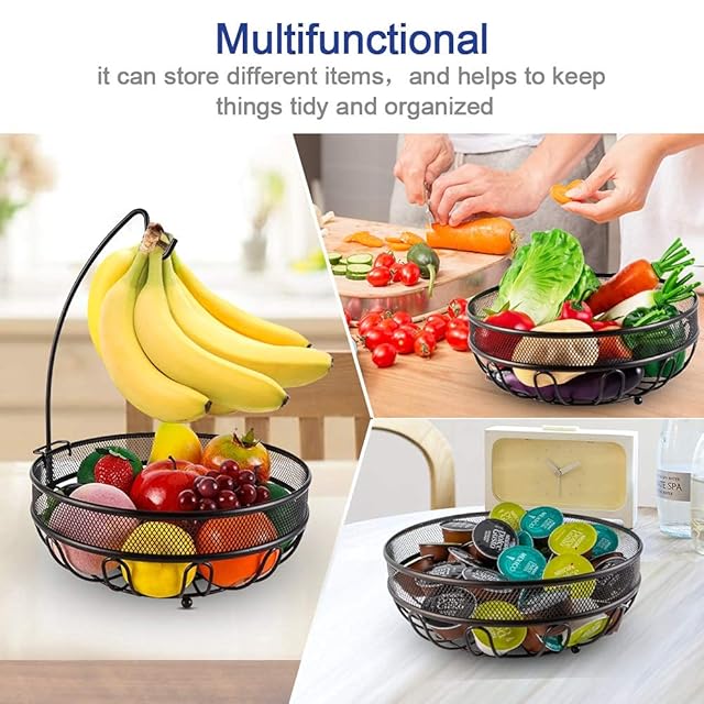 このフルーツバスケットは、バナナハンガー付きで、28cm x 11.5cm x 28cmの広いスペースを提供します。ブロンズコーティングでクラシックでシンプルなデザインで、バナナやブドウなどのフルーツを吊るすことができます。また、お茶やコーヒー用品、スナック、画材、バスルーム用品など、多様な用途に使用することができます。
