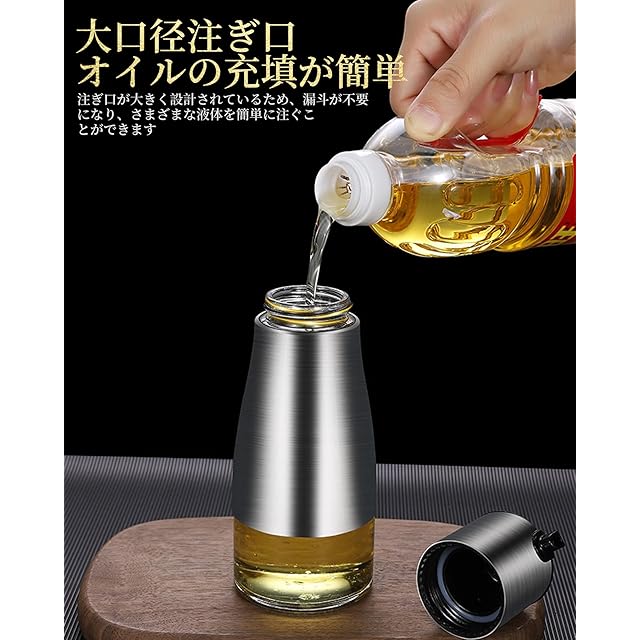 【耐熱ガラスのオイルボトル】 容量:240ml。 調味料ボトルのガラス材料耐熱ガラスはホウケイ酸という化学名で軽くで非常に優れた耐熱衝撃性を備えて、うっかり火のそばに置いても安心です。商品は日本食品検査を受けましたので、ご安心にお使えいただけます。