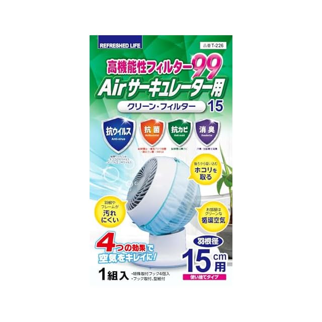 ■高機能性フィルター99 Airサ-キュレ-タ-用 クリーンフィルタ― 15<br>・羽根径15㎝用<br>・左右回転+上下首振りタイプ(地球儀タイプ)にご使用いただけます。<br>・抗ウイルス・抗菌・効カビ・消臭の公的試験機関の効果評価試験のエビデンスを担保しています。<br>・「ウイルス・雑菌・カビ」の繁殖を抑制し、安心で清潔なお部屋の空気をお届けします。<br>「ホコリ」も防止してお掃除軽減!<br>・抗ウイルス・抗菌・効カビ・消臭の高機能性フィルターはお部屋の空気をクリーンで爽やかに!<br>・後ろから吸い込むホコリを取る!!羽根やフレームが汚れにくい!!お部屋はクリーンな循環空気!<br>・ご覧頂いている商品の写真につきましては、できるだけ実物の色に近くなるように努めておりますが、お使いの環境(モニター、ブラウザ等)の違いにより、色の見え方が実物と若干異なる場合がございます。ご了承くださいませ。