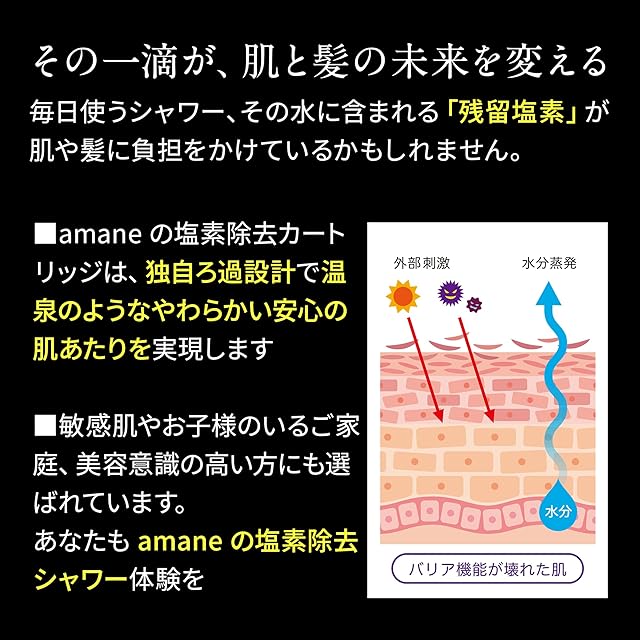 【使用上の注意】<br> ・本品はamaneシャワーヘッド専用カートリッジです。<br> ・60度以下でお使いください。故障、変形、変色の原因となリます。<br> ・使用中、皮膚にかゆみ等の刺激を感じた場合は使用を中止してください。<br> ・カートリッジ本体は分解したリ、中身を取出したりしないてください。<br> ・カートリッジ取り付け、または交換後1 分ほど流してからお使いください。<br> ・1日8分(8L/分)使用の場合カートリッジ1個あたリ約1ヶ月となリます。<br> ・長期間(1ヶ月以上)使用しなかったときは交換してください。<br> ※カートリッジの寿命は水質、使用条件、残留塩素濃度、地域差などにより短くなることがあります。<br> ※交換後のカートリッジは各地方自治体のルールに沿って廃棄ください。