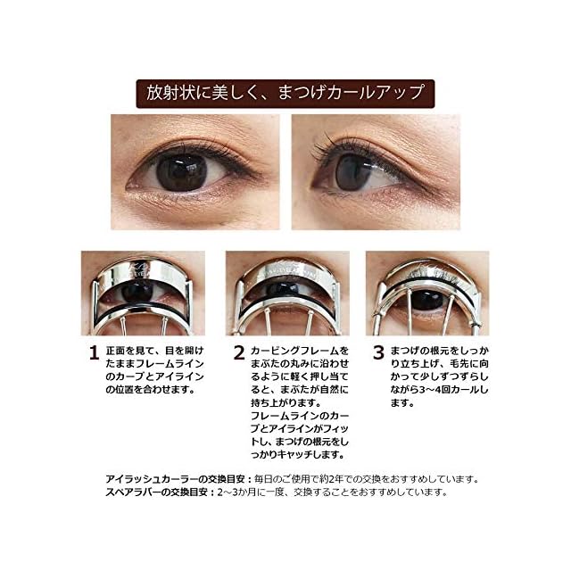 まつげを根元からキャッチし、美しい放射状に広げるアイラッシュカーラー。<br> 日本人女性のまぶたのカーブを測定して作られました。<br> <br> ●フラットエッジ<br> フレームの内側に支柱がないのでまぶたにピタッと密着します。<br> <br> ●カービングフレーム<br> 目の丸み・目幅・目を開けた時のアイラインの3点に合わせた設計になっています。<br> <br> ●目幅38mmのワイドサイズ<br> 幅広いフレームで目尻から目頭までまつげをしっかりキャッチします。<br> <br> ●替えゴム2個付き<br> <br> ●専用ケース付き<br> 抗菌仕様でポーチに入れてもかさばらないコンパクトサイズです。<br> ケースの内側に替えゴムを1個収納できます。<br> <br> ★カービングアイラッシュカーラーは、通常のアイラッシュカーラーよりも繊細な構造です。<br> ケースを使用することでフレームのゆがみや傷、汚れを防止します。<br> 品質を保ち、長くお使いいただくためにケースの使用をおすすめしています。