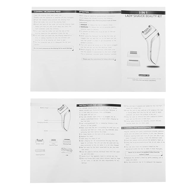 <br />特徴:<br /><br /><br />3合1脱毛: 電気シェーバー、コードレスヘアリムーバー、カルスリムーバーを含む女性向けの3合1電気シェーバーキットで、毎日使用できます。<br /><br />ポータブルデザイン: 人間工学に基づいたコンパクトなサイズとユニークな外観により、自宅でも外出先でも簡単に持ち、使用できます。<br /><br />取り外し可能 & 充電式: USBケーブルを接続して充電できます。コードレス設計で、取り外し可能で、素早いタッチアップと外出先でのシェービングが可能です。<br /><br /><br />注意:<br /><br /><br />トリマーヘッド水洗い可能(充電式本体は不可)<br /><br />ヘアリムーバーを乾いた状態に保ちます。<br /><br />ヘアリムーバーのヘッドからヘアリムーバーのディスクを取り外そうとしないでください。<br /><br />シェービングヘッドは、使用後毎回きれいにします。<br /><br />損傷を防ぐために、実行中のヘアリムーバーを髪、眉毛、まつげ、衣服、糸、ブラシなどから離してください。<br /><br /><br />仕様:<br /><br /><br />製品名: 3合1脱毛キット<br /><br />素材: ステンレス鋼<br /><br />数量: 1キット<br /><br />カラー:ホワイト<br /><br />ヘアリムーバーのサイズ:14x6x3 cm(L*W*H)<br /><br />ヘアリムーバーヘッドサイズ:6x3x3.5 cm (L*W*H)<br /><br />カルスリムーバーヘッドのサイズ:6x3x3.5 cm(L*W*H)<br /><br />シェーバーヘッドサイズ:6x3x3.5 cm(L*W*H)<br /><br />インジケータライト: 緑 : フル充電; 赤: 低バッテリー状態<br /><br /><br />パッケージリスト:<br /><br /><br />1個のヘアリムーバー<br /><br />1個のヘアリムーバーヘッド<br /><br />1個のカルスリムーバーヘッド<br /><br />1個のシェーバーヘッド<br /><br />1個のクリーニングブラシ<br /><br />1個のUSB充電ケーブル<br /><br />1個のユーザーマニュアル<br /><br />