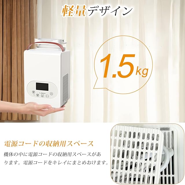 【安全保護と超軽量】ふとん乾燥機は耐久性の高く、難燃素材を使用していて、過熱保護機能も搭載しています。機体の温度が設定温度以上になるとき、自動的に運転off、安全性が高いです。僅か1.5kgの超軽量設計で、本体サイズL150xW128xH237mmで、一般の雑誌よりも小さい、クロゼットや引き出しなどに気軽に収納できます。コンパクトサイズで省スペース!
