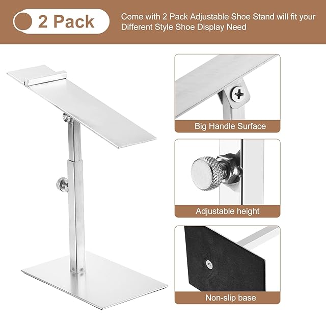 <br />説明:<br /><br />電気メッキ仕上げの 2 個セットの靴ディスプレイ スタンドは、何年も新品の状態を保つことができ、家庭、小売店、ショールームに最適です。<br />ステンレス鋼製で耐久性があり、錆びにくく、色褪せしにくいので、革靴、スニーカー、ブーツ、ハイヒールなど、さまざまな種類の靴のディスプレイにフィットします。<br />高さ調節可能なデザインのシューズホルダーは、さまざまなディスプレイのニーズに合わせて、さまざまなタイプやサイズのディスプレイに使用できます。大きなホルダー表面はアイテムをより安定して保持でき、ディスプレイ上でより美しく見えます。<br />他の靴ラックと比較して、安定性を確保するためにベースが厚く重さのあるこの靴ディスプレイラックは、より多くの重さを運ぶことができ、安定したままさまざまな種類の靴を展示できます。