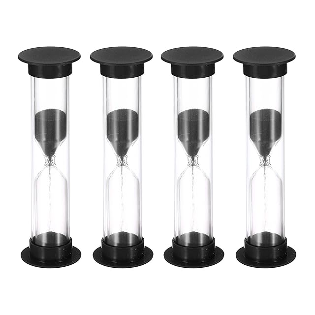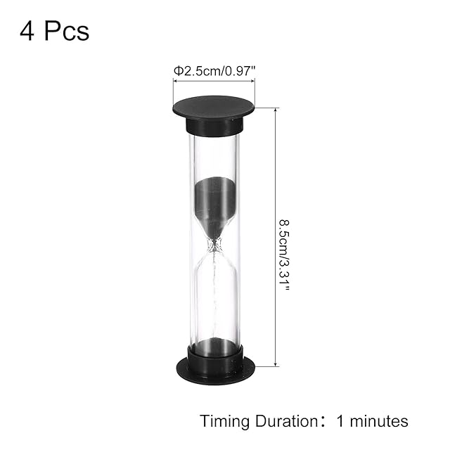 カラー:ブラック;素材: プラスチック、ガラス、砂;サイズ:2.5 x 8.5cm(D x H);最大タイミング持続時間:1分;パッケージ内容:4個 x サンドタイマー