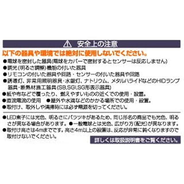点灯停止照度:約130ルクス以上、点灯時間:約120秒、探知範囲:360度・半径約3m ※取付高さ2.5mの場合