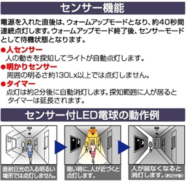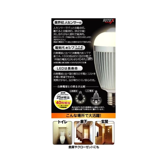 商品名:ムサシ RITEX 人センサー付LED電球 40型 【電球色】 E17口金 S-LED40L17
