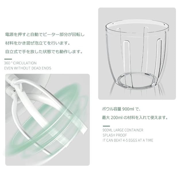 ■【自動で泡立てが可能な電動泡だて器】:直径122×高さ245mmの卵型。ボウル容量900mlで、最大200mlの材料を入れて使えます。上部のモーター部、かき混ぜる中央のビーター(4本の棒状の物)、ボウルで構成。