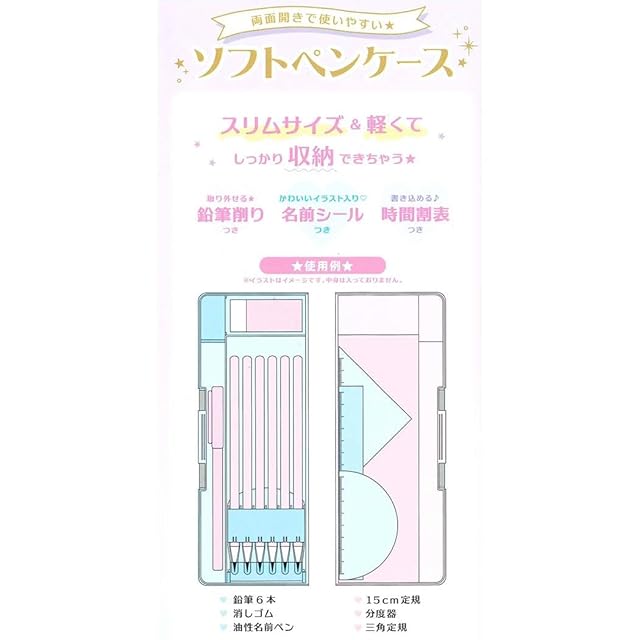 新学期にぴったりなステーショナリー こちらは定番アイテム【両面開きソフトペンケース】 開閉がスムーズなワイドマグネット付き。 取り外し可能の鉛筆削りや6本ペンシルホルダー付き。 お名前シール&時間割り表もついて紛失防止も。 ■サイズ:約225×85×31mm