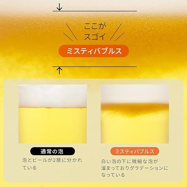 うまいビールの証「ミスティバブルス」泡とビールの間にできる霧状の泡「ミスティバブルス」 この細かい泡がクリ−ミーな泡を再生させ、最後までビールのうまさを持続させます。※よく冷えたビールと清潔なグラスをご用意ください。