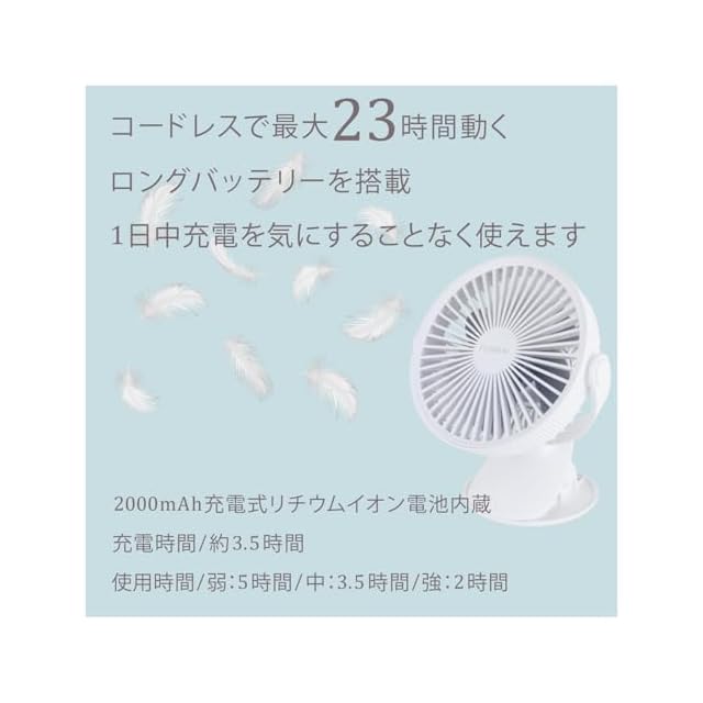 【2000mAh充電式リチウムイオン電池内蔵】充電時間3.5時間で弱風時は約5時間、中風時は約3.5時間、強風時は約2時間使用可能です。USBアダプターからも簡単に充電可能で充電中も使用できるため、どこでも快適な風を楽しむことができます。本体と電源を接続すると充電ランプ(充電中:赤/充電済:緑)が点灯します。※コードレスでの使用は、始めに本体を充電してください。