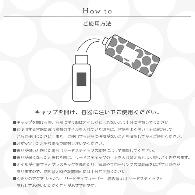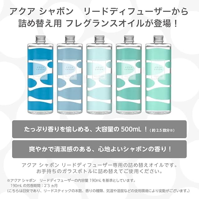 アクア シャボン リードディフューザー専用の詰め替えオイルです。 お手持ちのガラスボトルに詰め替えてご使用ください。 ガラスボトル、リードスティックは付属していないため、単品ではご使用いただけません。