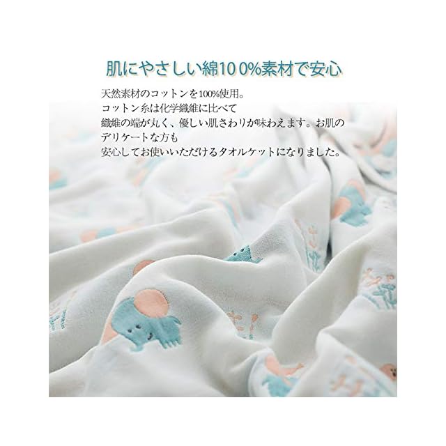 【天然素材】肌に優しい天然素材綿100%を採用しております。柔らかくて軽く、肌に優しいのでデリケート肌の赤ちゃんや敏感肌の方にも安心してお使いいただける一枚です。チクチク肌を刺して刺激することもありません。 【ガーゼケット】ふんわり柔らかな風合いながら、サラッとした感触のガーゼケットです。熟練の職人がしなやか細い糸を使用して平織り組織を6重に織り上げました。ガーゼの特徴として吸湿性・通気性がとても優れているので、水分を素早く吸収して、汗をかいてもすばやく乾いて気持ちいいです。 【オールシーズン使える】夏の必需品であるタオルケット。夏用の寝具というイメージが強いですが、実は年間通して使える優秀アイテムなんです。 【洗濯】ご家庭の洗濯機で丸洗いが可能ですので、いつも清潔にお使いいただけます。お洗濯の際は、洗濯ネットをご使用ください。また、洗濯後、形を整えてから干してください。※ご使用前には一度お洗濯をしてください。※乾燥機・塩素系漂白剤のご使用はお避け下さい。商品説