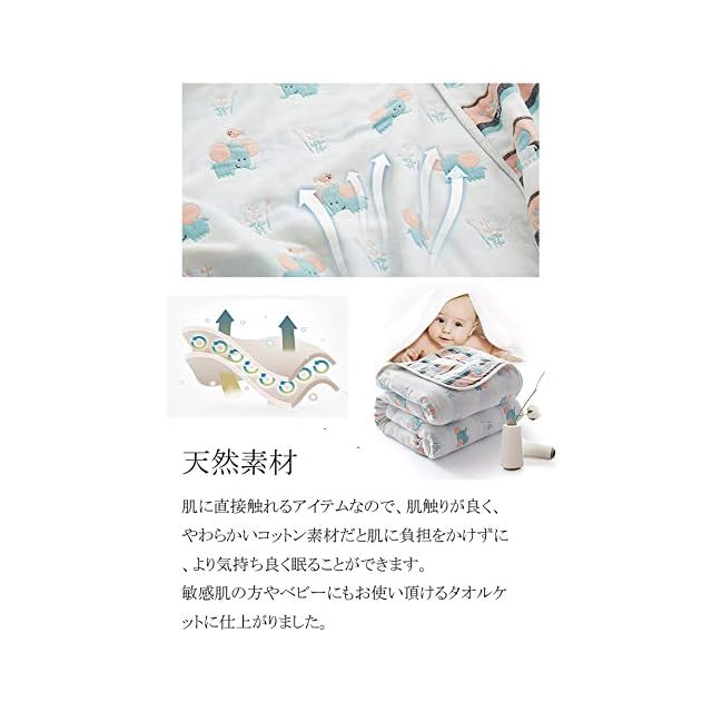 【天然素材】肌に優しい天然素材綿100%を採用しております。柔らかくて軽く、肌に優しいのでデリケート肌の赤ちゃんや敏感肌の方にも安心してお使いいただける一枚です。チクチク肌を刺して刺激することもありません。 【ガーゼケット】ふんわり柔らかな風合いながら、サラッとした感触のガーゼケットです。熟練の職人がしなやか細い糸を使用して平織り組織を6重に織り上げました。ガーゼの特徴として吸湿性・通気性がとても優れているので、水分を素早く吸収して、汗をかいてもすばやく乾いて気持ちいいです。 【オールシーズン使える】夏の必需品であるタオルケット。夏用の寝具というイメージが強いですが、実は年間通して使える優秀アイテムなんです。 【洗濯】ご家庭の洗濯機で丸洗いが可能ですので、いつも清潔にお使いいただけます。お洗濯の際は、洗濯ネットをご使用ください。また、洗濯後、形を整えてから干してください。※ご使用前には一度お洗濯をしてください。※乾燥機・塩素系漂白剤のご使用はお避け下さい。商品説
