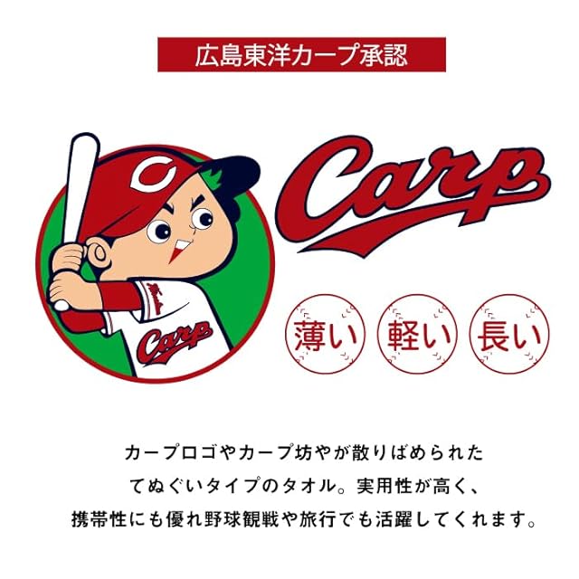 日本の風土が生んだ和てぬぐいの使い勝手の良さと、タオルが持つ吸水性と柔らかさを併せ持った、万能タオルです。一般的なフェイスタオルよりも20cmほど長く、100cmあります。 首にかけても落ちにくく、端を結ぶことが出来ます。 保冷剤を包み首に巻いたり、水に濡らして頭に巻けば暑さ対策にもなります。表はさらっと爽やかなガーゼ地、裏はタオルの柔らかさを感じられるパイル地です。 綿100%で吸水性も優れていて赤ちゃんにも安心してお使いいただけます。 洗顔や入浴、キッチン、スポーツ、ガーデニングなど様々なシーンで活躍。 特に入浴時にはボディータオルとして使用し、パイル地部分で泡立て、体を洗うのはガーゼ、 パイル地、好みにより使い分けできます。 とても薄いのでお子さまやご年配の方でも簡単に絞れるのも嬉しいポイント。薄いので通気性が良く速乾性にも優れています。 梅雨や冬時期の洗濯物が乾かないシーズンでもダントツで乾きが速く、 毎日気兼ねなく使えるのが嬉しいですね。日常使いはもちろん、旅行や外出時には薄手で軽いのでかさ張らず重宝します。 ※この商品はカープ承認応援グッズです。※ 柄:カープチェッカー・カープ赤ヘル・カープビクトリー サイズ:33×100cm 素材:綿100% 生産国:日本製(今治製)