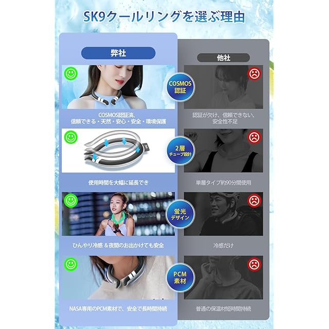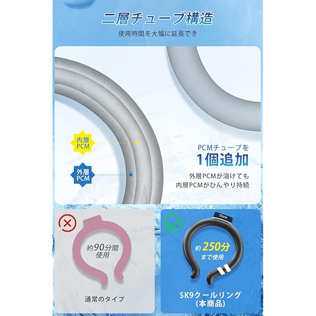 【クールリング 二重構造&250分間ひんやり持続&快適な装着感】二層チューブ構造のネックバンド持続時間を最大2倍し、ひんやり感が今までの倍以上になります。●持続時間を250分間に延長されました。熱中症対策 ネッククーラーを装着すれば、簡単に心地よく涼しさをもたらし、いつでも快適に過ごせそう。●さらに軽量で、首に負担を掛けません。子供も大人も男女問わず楽に使用できる クールリング です。