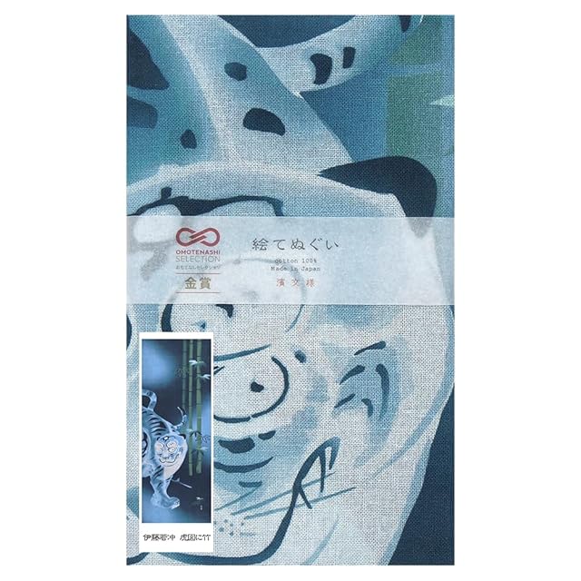 【伊藤若冲 虎図に竹】<br> 江戸時代の絵師、伊藤若冲の描いた<br> 「虎図」をアレンジした絵てぬぐい。<br> 全体的に幻想的なタッチと色合いで仕上げました。<br> <br> 【絵てぬぐい】<br> 1枚の絵としてお飾りいただける「絵てぬぐい」は、<br> てぬぐいとしてはもちろん、季節感あふれるインテリアとしても好評です。<br> 横浜の粋と遊び心を持つ濱文様らしさに溢れた「絵てぬぐい」を是非お楽しみください。<br> <br> ◆素材:綿100% (厳選した木綿生地を採用しています)<br> ◆サイズ:約34cm×90cm (布の伸縮により多少の誤差があります)<br> <br> 【製品仕様】<br> ・横浜伝統の型染め手法である ”捺染 (なっせん)” でお作りしています。<br> ・柄のプリントは片面 (表) のみとなっております。<br> ・端を縫わない ”切りっぱなし” 仕様の、昔ながらのてぬぐいです。<br> ・ほつれは自然と止まりますので、適宜ハサミでカットしながらお使いください。<br> <br> 【注意事項】<br> ・色合いはご覧頂く環境によって印象が異なる場合があります。<br> ・濃色は色落ちする場合がありますので、単独での手洗いを推奨しております。<br> ・塩素系漂白剤はご使用にならないようお願いします。<br> ・濡れたまま重ね合わせたりすると色が滲む場合がありますのでご注意ください。<br> ・素材の特性上、洗濯をすると多少縮みます。<br> ・額装する場合は水通しせず、アイロンと霧吹きでシワを伸ばしてお飾りください。<br> <br> 【ブランド】<br> 横浜のテキスタイルブランド「濱文様」(はまもんよう) は、<br> 横浜伝統の型染め手法である ”捺染 (なっせん)” で染め上げた色あざやかな「てぬぐい」や<br> 風呂敷・タオル・ハンカチなどを中心に、数多くの和雑貨を企画・製造・販売しています。<br> <br> 遊び心のある個性的なデザインが特徴で、<br> 四季折々の風情を感じさせるオリジナルデザインを発信し続けています。<br>